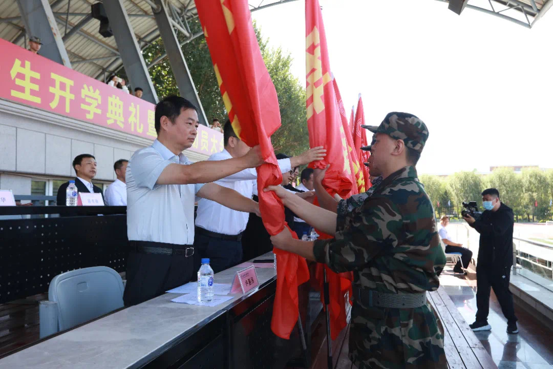 校领导向军训团授旗,学生处处长、军训团长谈小平宣读了2023级新生军事课的教学目标、教学内容和教学安排。