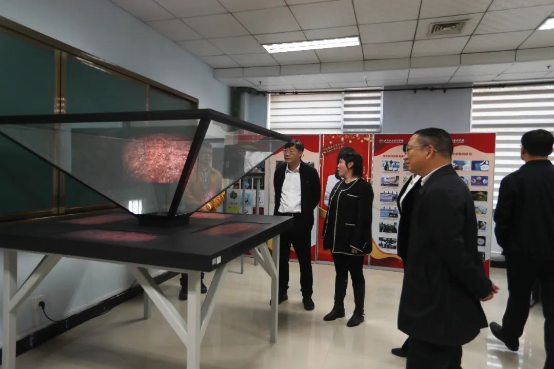 在艺术学院,副院长王硕菲展示了全国“最美教师”高文铭名师工作室的教学成果,一行人共同参观了数字媒体创意实训基地。