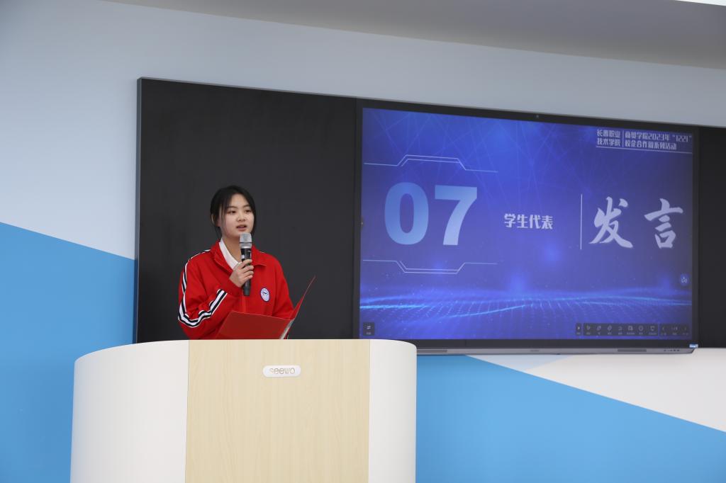 学生高子涵代表全体同学对现代学徒制班的成立表示了感谢,并做出承诺:在企业实习期间,服从学校安排,遵守企业规章制度,听从企业教师指导和教诲,不断提高实践技能水平,投身智慧物流发展大潮,做新时代合格的物流人。