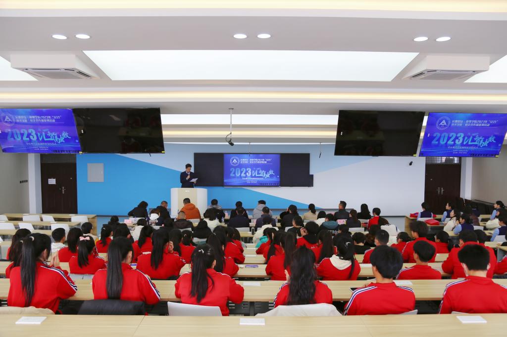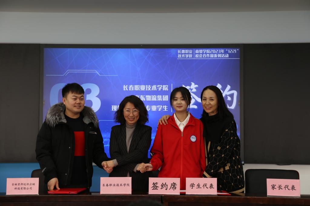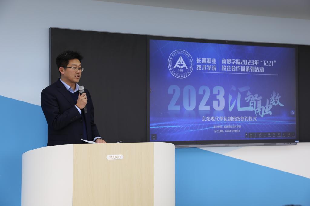 根据beat3652023年“1221”校企合作周整体工作安排,为了进一步深化产教融合,推进学校人才培养模式的改革,提升技术技能人才培养质量,12月20日下午,商贸学院在阶梯教室3-3举行京东现代学徒制班级签约仪式。长春职业技术学院副校长朱国辉,科研处处长周佩秋,教务处副处长李晓婧;京东物流吉林省战区运力总经理李爽,人力资源经理马铭泽,教育总监贺宇出席活动,学院院长朴仁淑、党总支书记梁春江、副院长王国龙、副院长赵天燕以及营销管理系全体教师、学生家长代表和23级现代物流管理专业全体学生参加活动。仪式由商贸学院副院长古今主持。