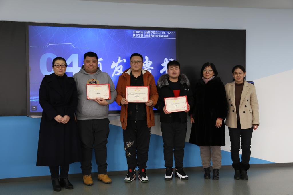 朱国辉副校长、周佩秋处长,李晓婧副处长为企业师傅马铭泽、李爽、贺宇颁发聘书。