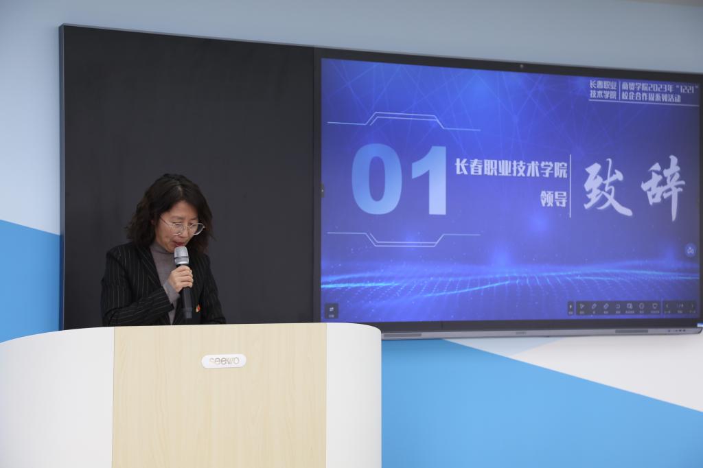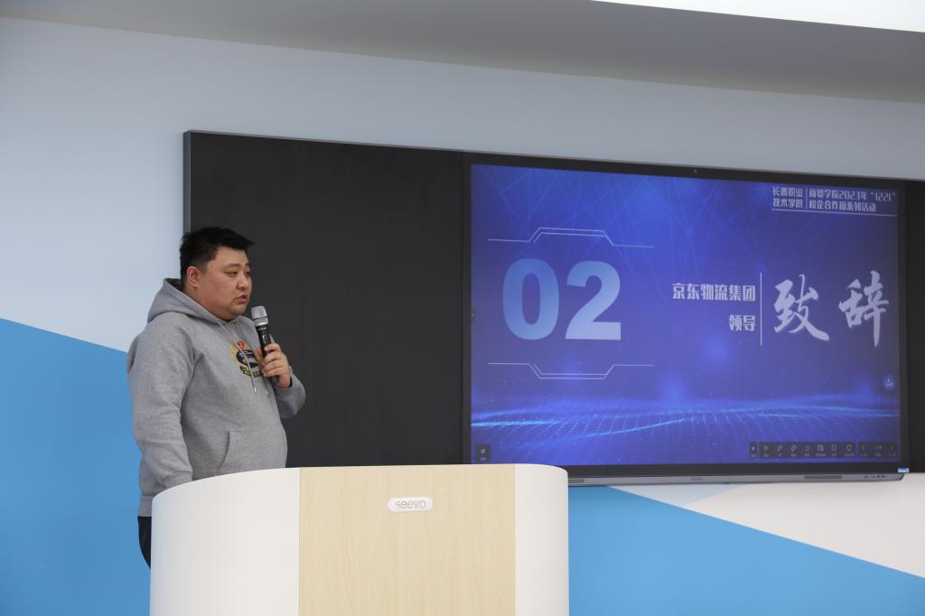 京东物流吉林省战区运力总经理李爽介绍了京东物流从创建到飞速发展的历史过程,强调了物流在现代社会的重要地位,感谢学校对京东物流的重视,对建立现代学徒制班级充满期待,希望学校能够为企业提供新鲜血液,是企业拥有更多的创新活力。