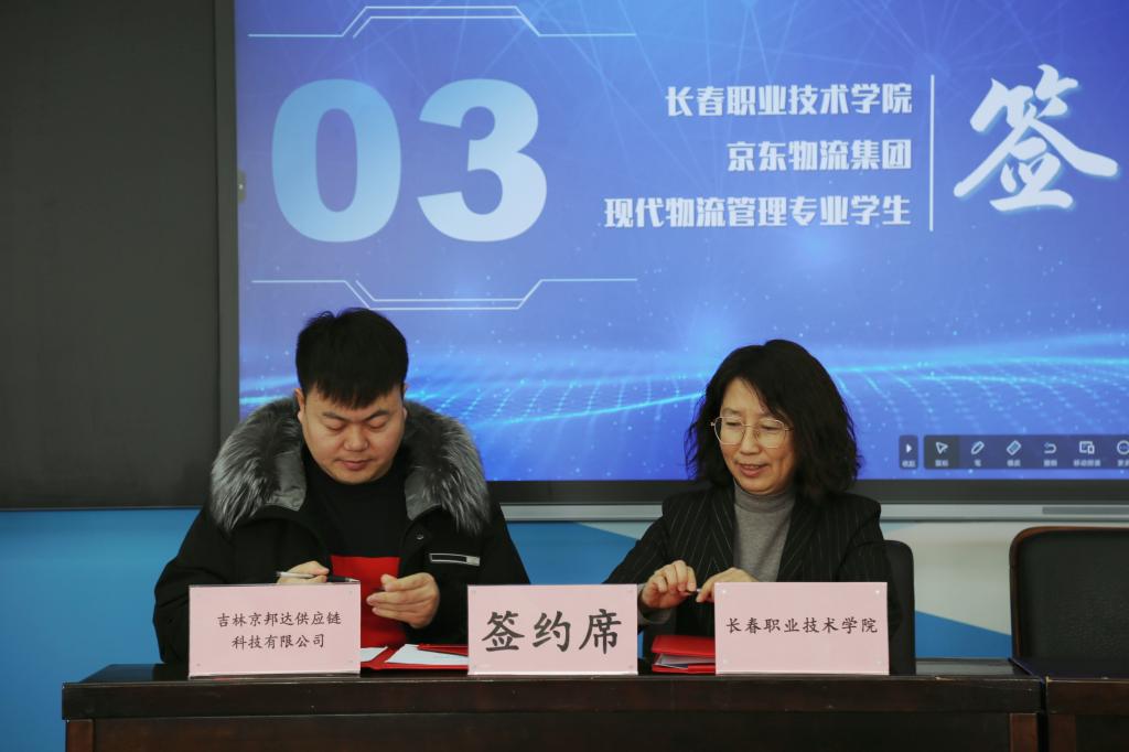 商贸学院院长朴仁淑与京东物流吉林京邦达供应链科技有限公司人力资源经理马铭泽进行京东现代学徒制协议签约。
