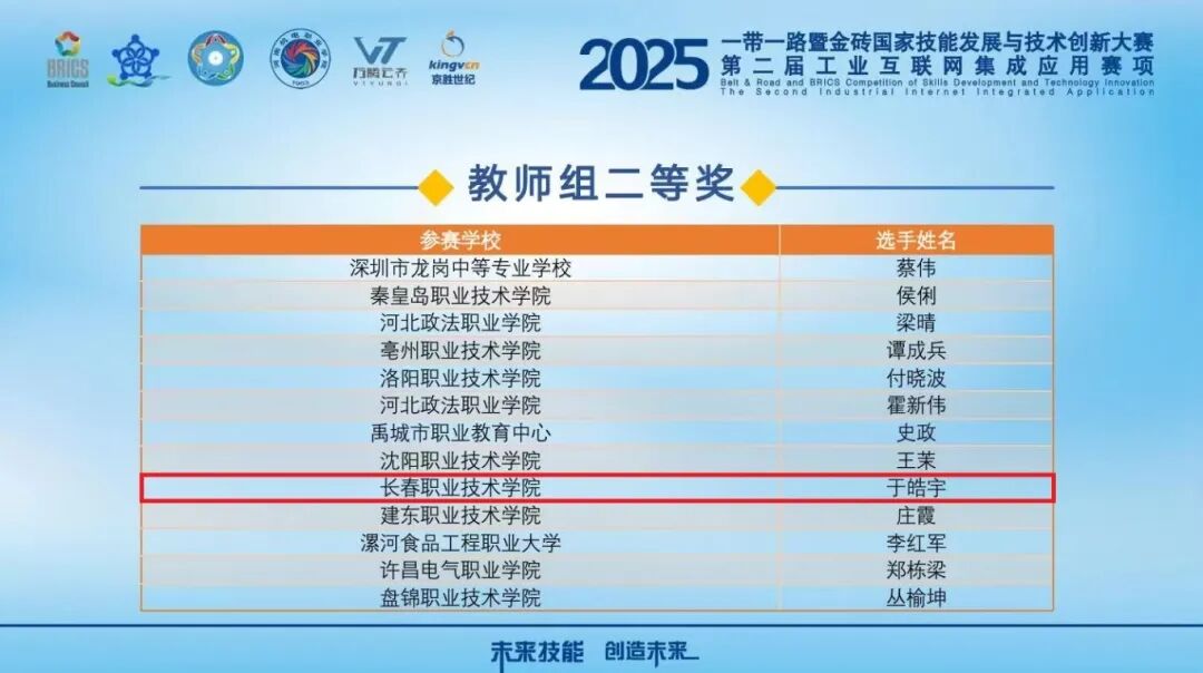 近日,2025一带一路暨金砖国家技能发展与技术创新大赛第二届工业互联网集成应用赛项决赛落幕。beat365师生在比赛中表现优异,取得了突出成绩。其中,信息学院教师于皓宇荣获教师组二等奖,由教师田晶指导的学生团队获高职组一等奖1项、三等奖2项。