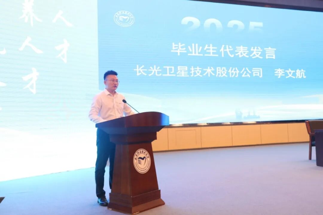 毕业生代表长光卫星技术股份有限公司现场工程师李文航分享了自己扎根长春、成长奋斗的经历。他提到,在校期间,学校的实践课程与扎实的理论知识为自己进入长光卫星工作打下了坚实基础。“长春给了我施展才华的平台,长光卫星让我看到了科技报国的可能,我很庆幸当初选择留在长春。” 李文航的分享充满对城市与企业的认可,也为在场学子提供了鲜活的就业参考。