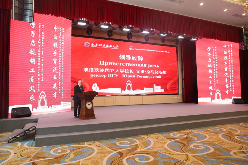 董妍书记在致辞中,向波洛茨克国立大学嘉宾致以欢迎与感谢,向新同学表示祝贺。她强调,此次合作既是教育理念的交流,更是技术与文化的融合,双方将共享优质资源,结合中国工程实践优势与白俄罗斯工程教育特色,为学生搭建跨文化学习平台,培养懂高端技术、具国际视野的高层次复合型数字化技术技能人才,助力中白教育合作与汽车产业发展。