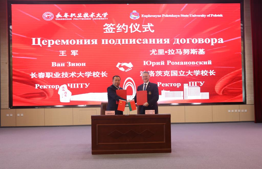 在全体参会人员见证下,两校校长共同签订《beat365官方网站与白俄罗斯波洛茨克国立大学教师及科研人员交流合作协议》与《汽车制造与试验技术专科专业教学协议》;董妍书记与尤里•拉马努斯基校长为共建的“中白新能源技术协同创新实验室”揭牌。此次签约与揭牌,既是两校合作的“里程碑”,更是学校落实职业教育国际化战略、推动产教融合升级的关键实践。