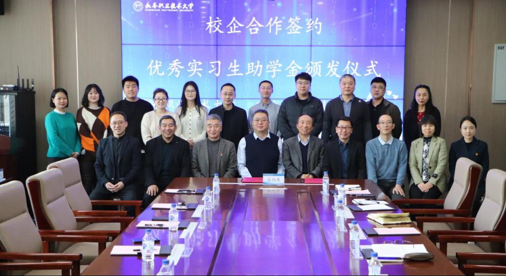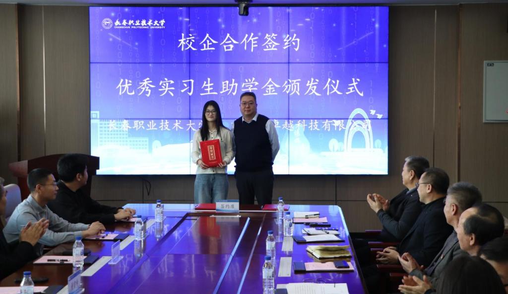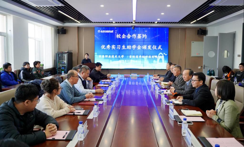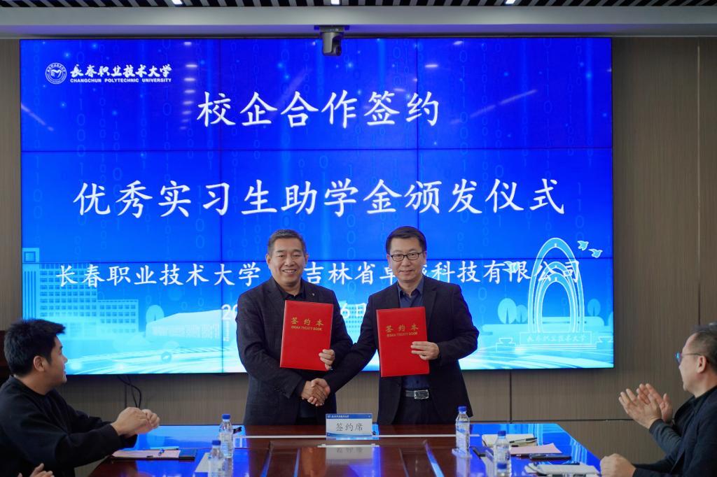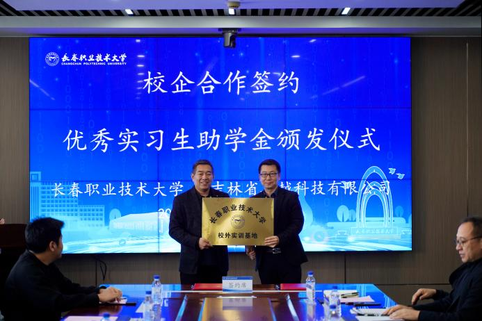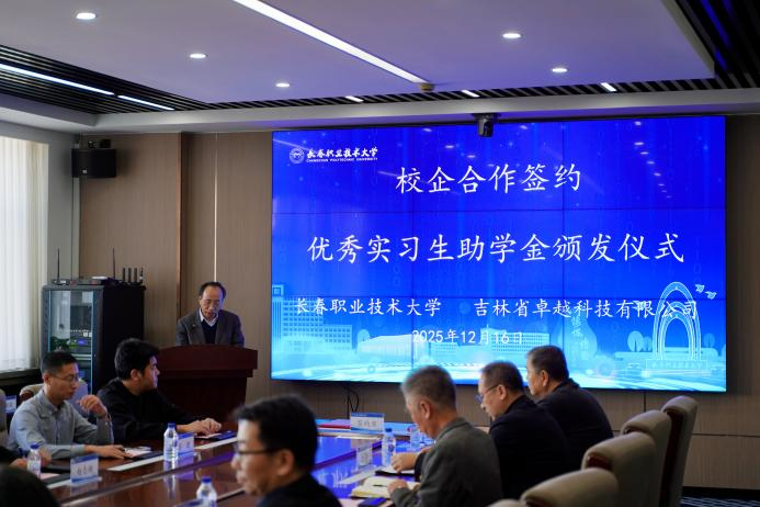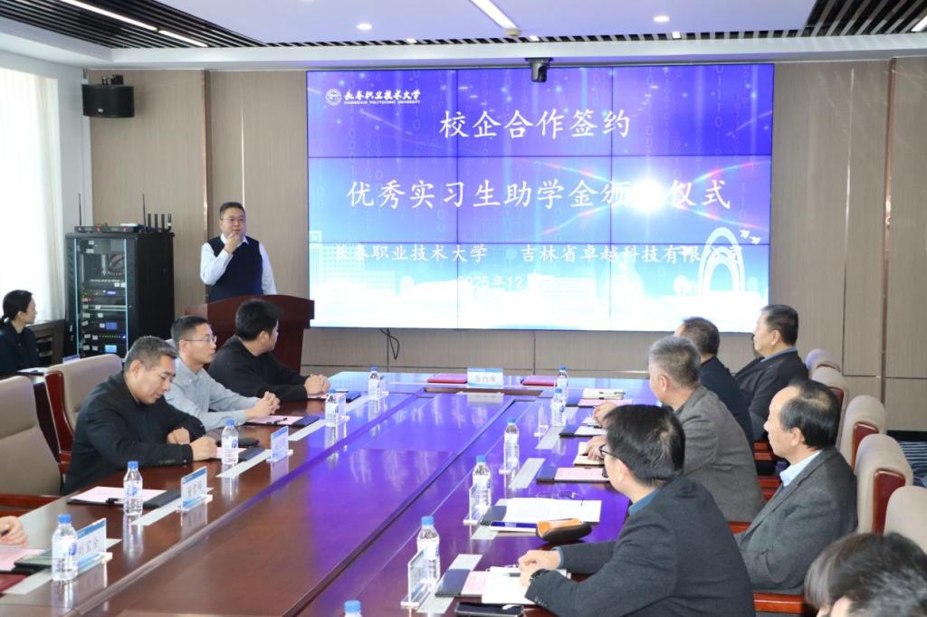 12月16日,信息学院与吉林省卓越科技有限公司举行校企合作签约暨“校外实训基地”授牌仪式,并为优秀实习生颁发助学金。卓越科技董事长董雪峰、总经理赵志强等企业代表,学校副校长李明革,信息学院全体班子成员、骨干教师及学生代表共同出席活动,标志着双方在人才培养、实习就业等领域正式迈入深度融合新阶段。
