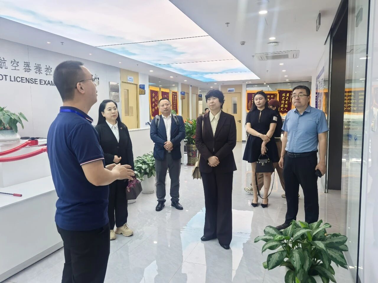 调研期间,董妍一行实地参观了全球鹰无人机有限公司的专利资质墙、无人机实训室、模拟飞行课堂和理论考场,详细了解企业在无人机培训领域的教学体系和运营模式。企业相关负责人还介绍了公司十年发展历程,以及在无人机人才培养方面的实践做法。