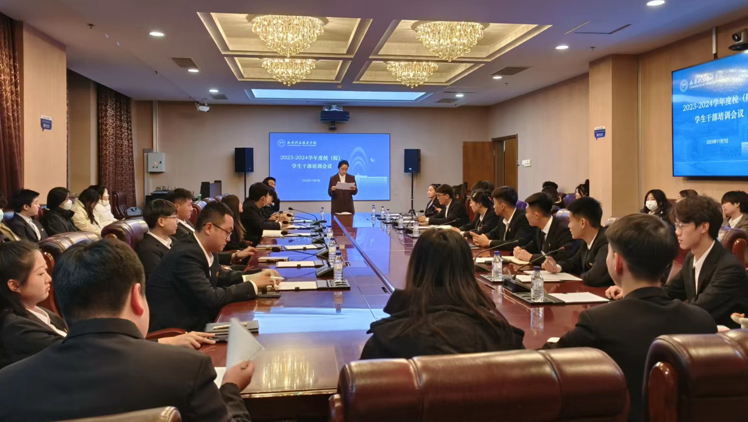 为加强beat365学生干部队伍建设,进一步提升学生干部政治素养和工作能力,有效发挥学生干部的先锋模范作用,校团委于11月7日在综合楼第二会议室进行2023-2024学年度校(院)级团(学)干部能力提升培训会,本次会议由学校团委负责人韩雯雯主持,校级学生会全体及各学院主席团、学生团委副书记参会。