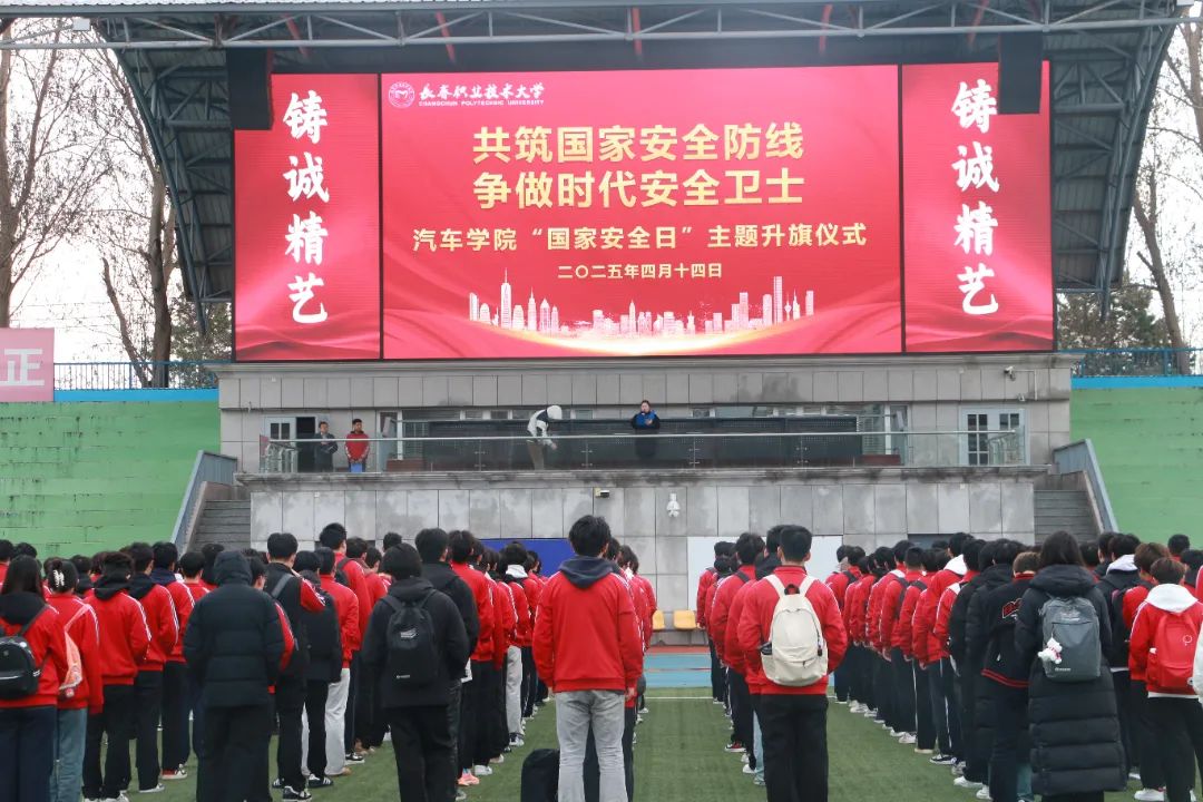 为深入贯彻落实总体国家安全观,增强师生国家安全意识,在第十个全民国家安全教育日来临之际,汽车学院于4月14日上午在学校体育场举行 “共筑国家安全防线,争做时代安全卫士” 国家安全教育主题升旗仪式活动。学院领导、教师代表及全体学生参加升旗仪式。
