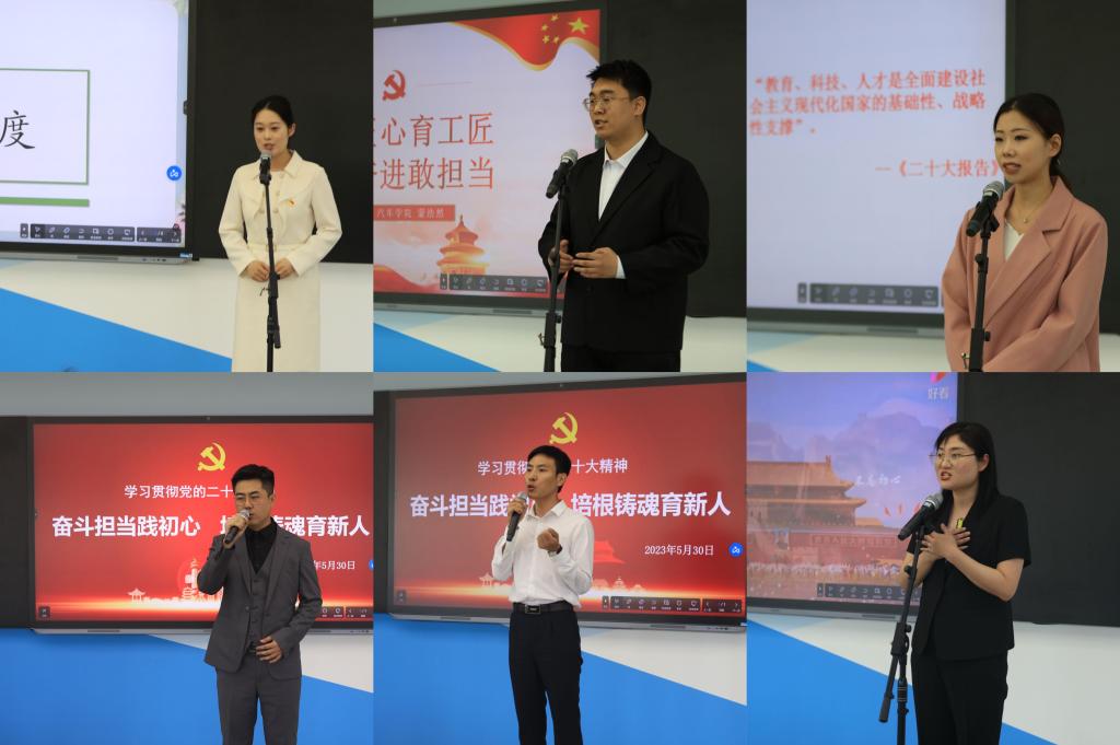 5月30日,学校“学习贯彻党的二十大精神——奋斗担当践初心 培根铸魂育新人” 青年教师演讲比赛在阶梯教室G3-3举行,来自全校11个党总支19名教师代表,深学细悟党的二十大精神,共话职业教育责任使命。11位评委由学校各党总支书记、学院领导担任,比赛由李茜老师主持,百名师生代表参与活动。